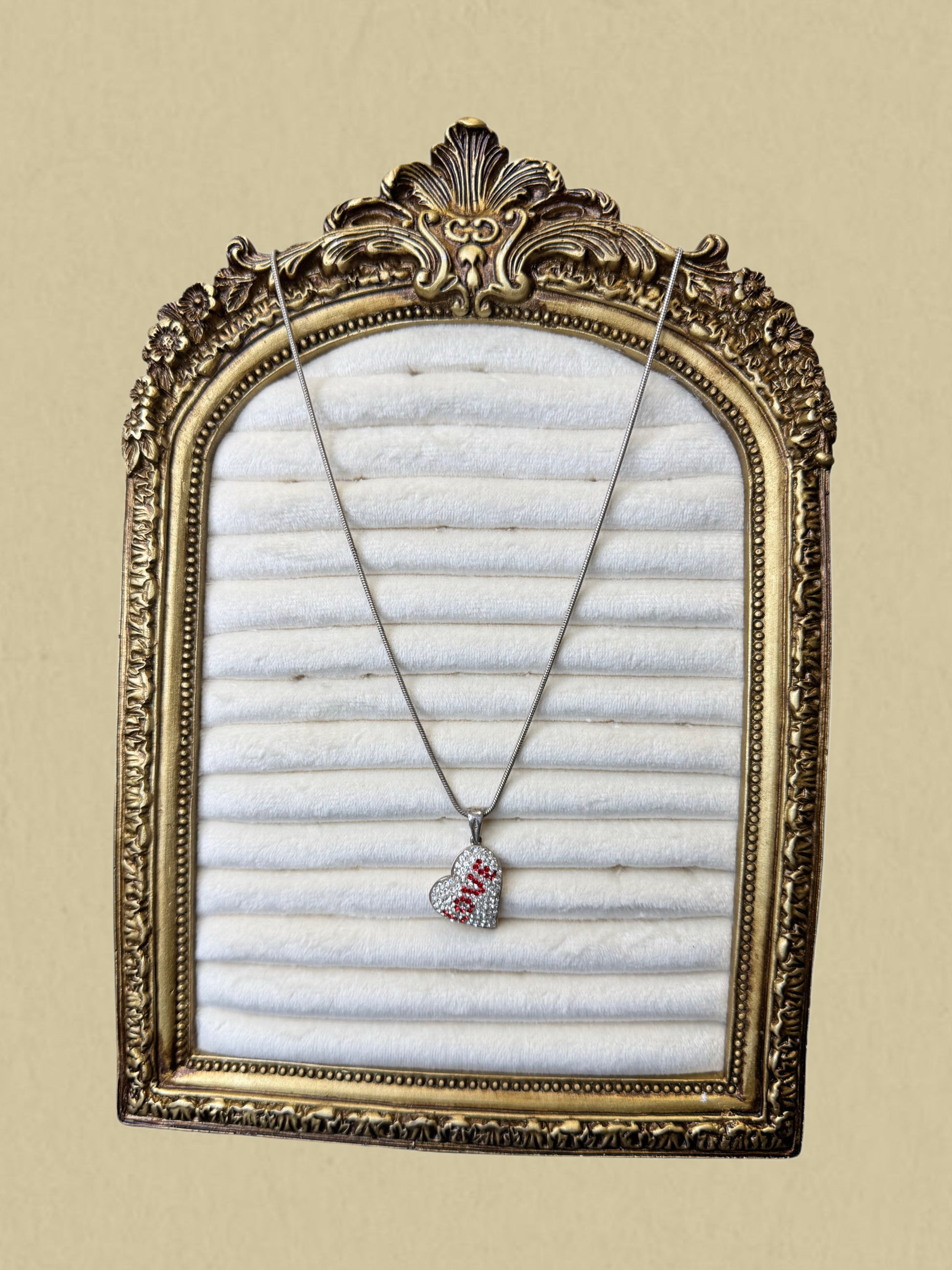Elegante Halskette mit funkelndem Herzanhänger. Das Herz ist vollständig mit klaren Swarovski Steinen besetzt und verfügt über ein rotes, dekoratives Muster.