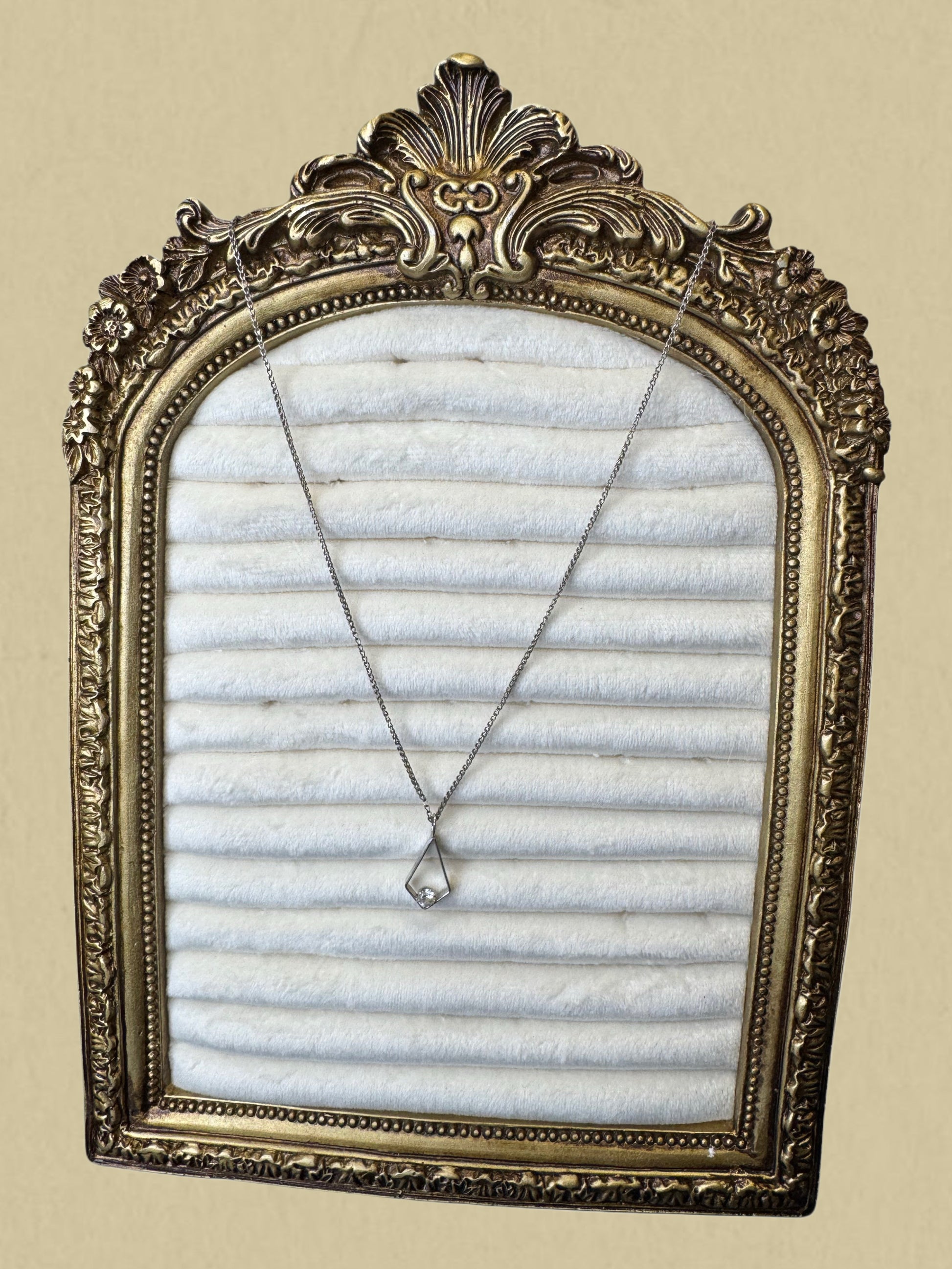 Diese zarte Halskette überzeugt durch ihr modernes, reduziertes Design. Der Anhänger zeigt eine offene, geometrische Form mit einer dezent eingefassten Schmuckstein-Fassung am unteren Ende. Elegant, clean und vielseitig kombinierbar.