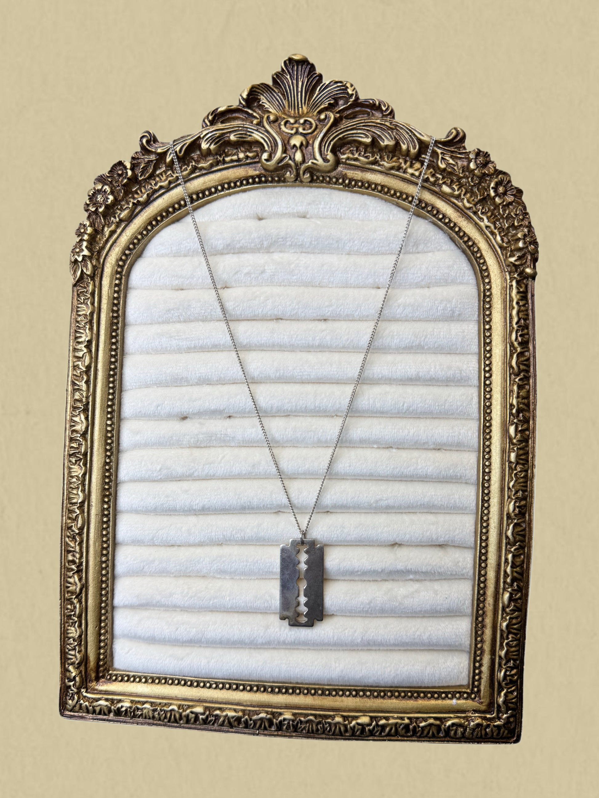 Diese markante Halskette überzeugt mit einem Anhänger in Form einer Rasierklinge – ein ikonisches Symbol aus der Punk-, Rock- und Retro-Szene. Das Schmuckstück ein stilvolles Statement und sowohl für Damen als auch Herren tragbar.