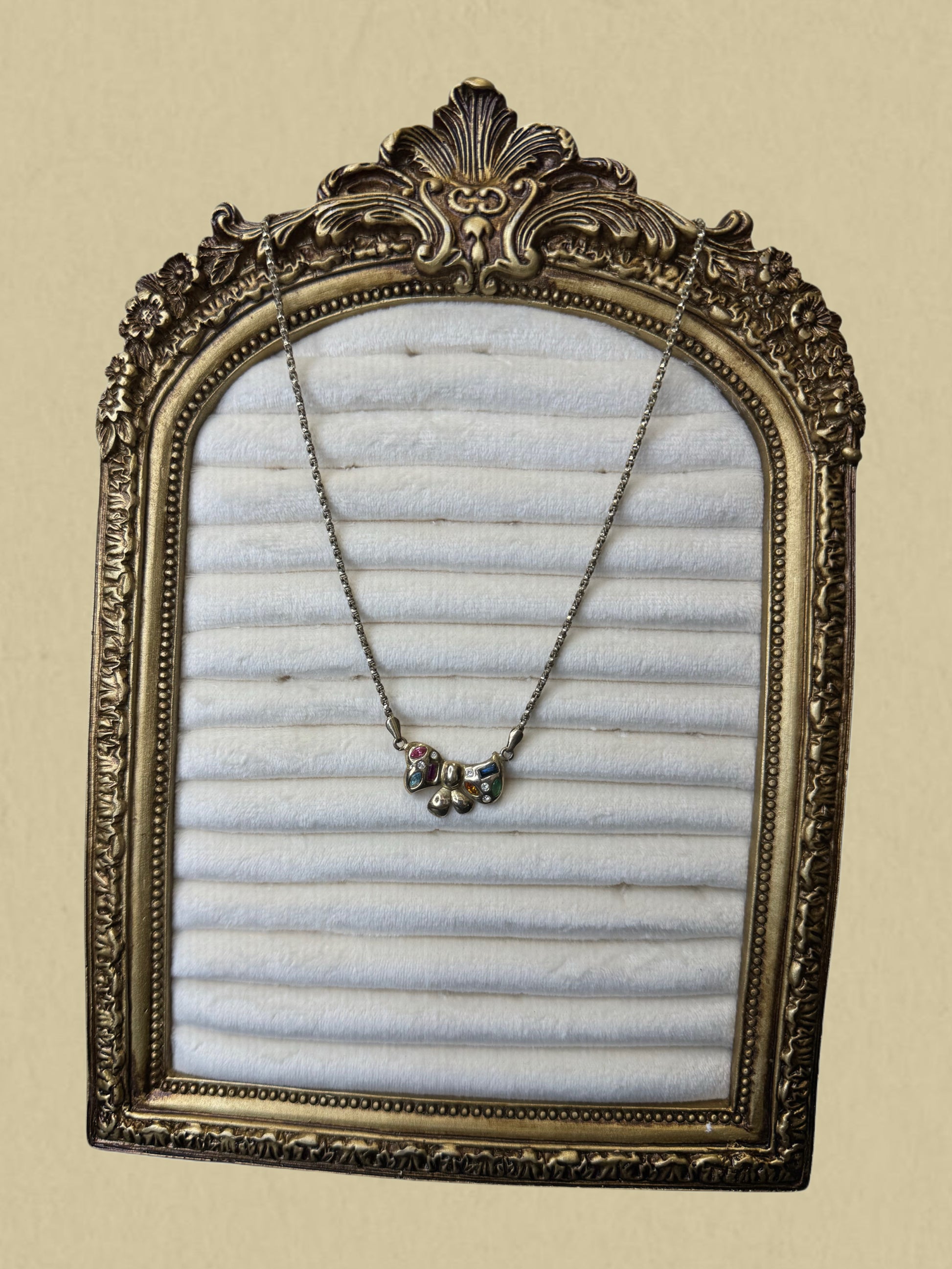 Diese einzigartige Halskette vereint verspieltes Design mit zartem Vintage-Charme. Im Mittelpunkt steht eine dekorative Schleife mit mehreren kleinen, farbigen Steinen in unterschiedlichen Formen und Tönen.