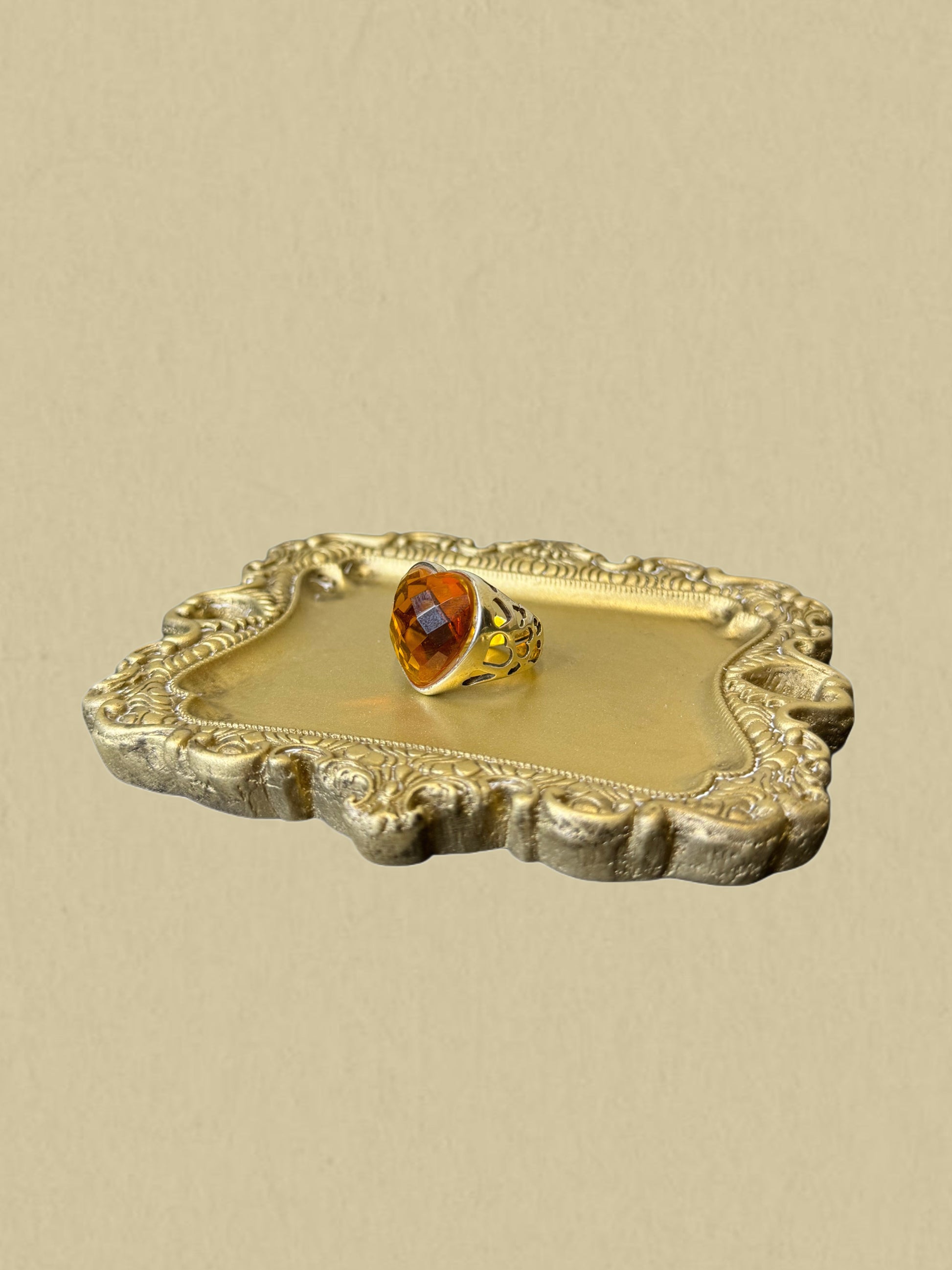 Auffälliger Vintage-Ring in warmer Goldoptik mit einem großen, facettierten orangem Stein. Die Fassung ist dekorativ durchbrochen und gibt dem Ring einen edlen, leicht orientalischen Look. Ein echtes Highlight für alle, die besondere Schmuckstücke lieben.