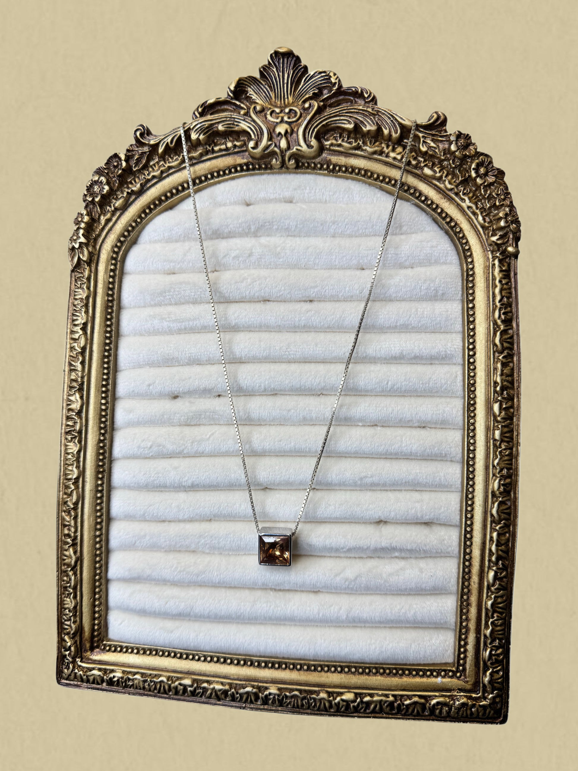 Diese stilvolle Halskette besticht durch ihren modernen, minimalistischen Anhänger in quadratischer Form. Der facettierte Stein zeigt einen warmen Braunton mit brillantem Schimmer – Rauchquarz. Die Kette ist vergoldet.