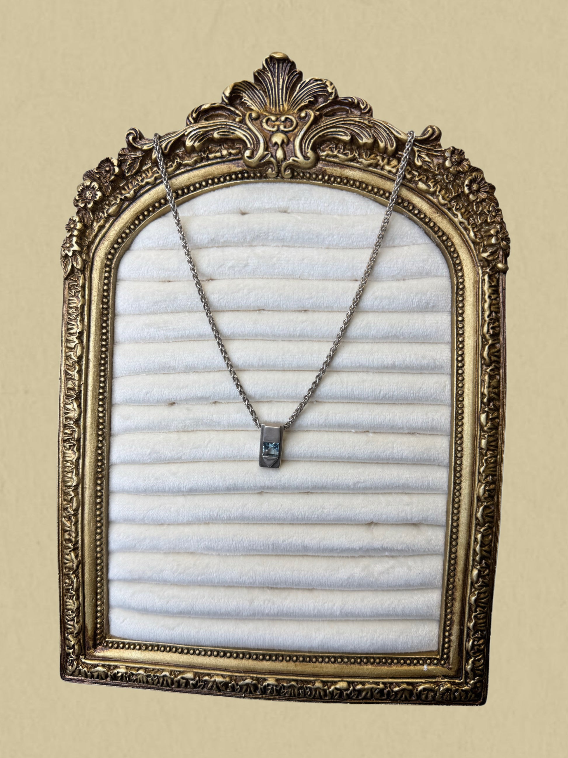 Diese elegante Halskette kombiniert ein minimalistisches Anhängerdetail mit einem dezenten Farbakzent. Der rechteckige Silberanhänger ist mit einem facettierten, hellblauen Zirkonien Stein besetzt – zart, modern und zeitlos schön.